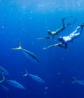 潜水员与鲨鱼在水下近身搏斗