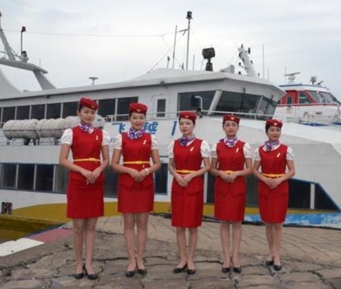 5月6日,执行中国防城港至越南下龙湾海上跨国旅游航线的“明港1号”高速客轮的服务员在旅游码头上列队迎接游客。 陈晶晶 摄
