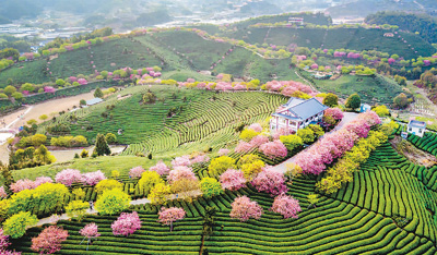 福建省漳平市永福镇台湾农民创业园内近日春意盎然,数十万株各色樱花渐次绽放,绿油油的茶树错落有致,红色的樱花与绿色的茶园交相辉映、美若画卷,吸引了众多游客踏青赏花。图为台创园景观。 |