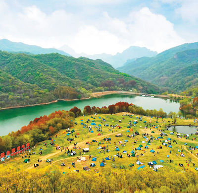 5月3日,首都各大公园迎来客流高峰,全市公园待客184万人次,与去年同期相比涨幅达103%。图为延庆区玉渡山帐篷营地,一顶顶小帐篷如同朵朵鲜花绽放在草地上。