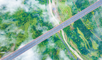 5月4日,湖南省湘西土家族苗族自治州吉首市雨后放晴,矮寨特大悬索桥周边云雾缭绕,美如画卷。