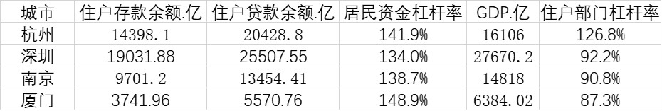 不同地区、不同城市,居民资金杠杆率、住户部门杠杆率也呈现较大差别。总体上,我国城市居民杠杆率呈现南高北低的格局。根据第一财经记者统计,在重点城市中,厦门、深圳、南京、杭州等东南沿海城市杠杆率较高。