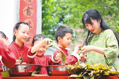 近日,浙江省杭州市淳安县汾口镇小学的学生在老师的指导下包粽子,做香囊,了解端午节的来历和习俗,感受端午节的文化内涵。