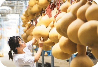 图为民俗文化产业园工人魏艳慧正在晾晒大棚里挂晒葫芦。杨振亚摄影报道