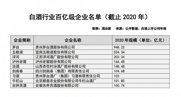截至目前,白酒行业的百亿级企业仅贵州茅台、五粮液、洋河股份、泸州老窖、汾酒、古井贡酒、牛栏山、剑南春、习酒9家而已。