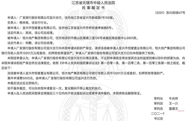 7月19日,广发银行请求冻结恒大方面银行存款1.32亿元。