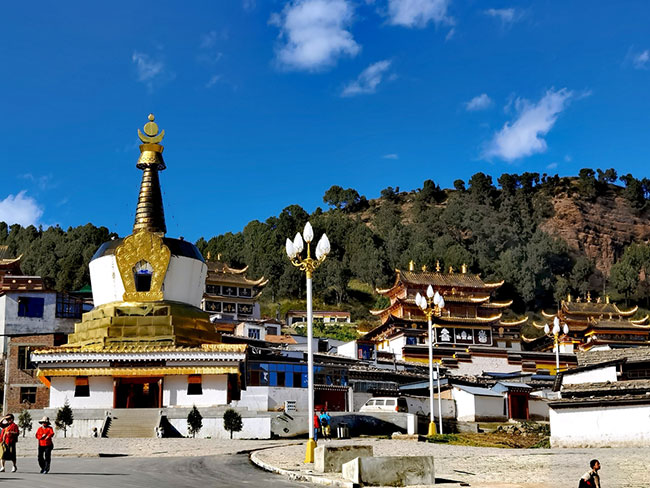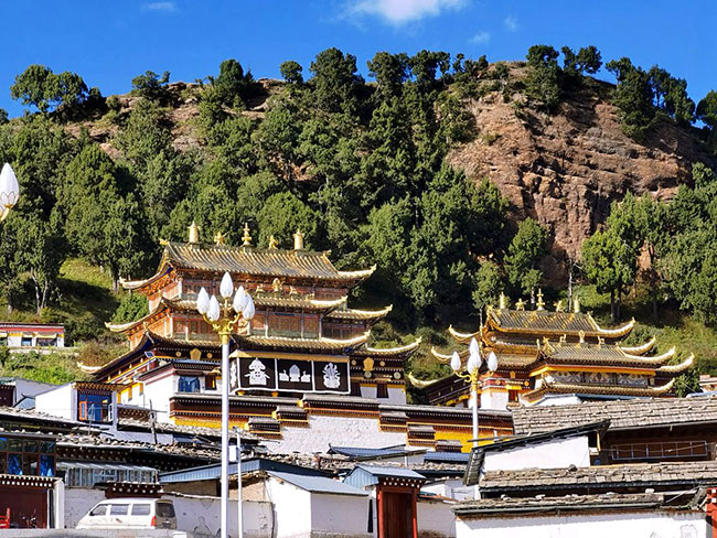 寺庙区前,是松林茂密的小山坡,登高望远,寺庙东面石峰嶙峋嵯峨,南面红色砂砾岩壁高峙,远处群峰环伺,森林墨绿,山下两省共辖的郎木寺镇,在夕阳的霞光中显得世外桃源般的静谧。