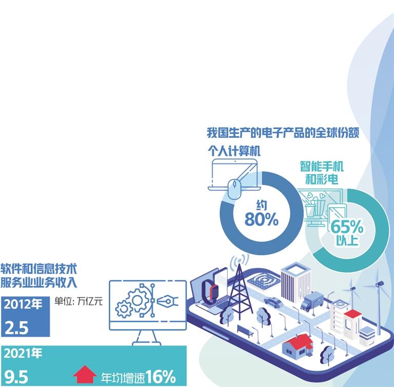 经济日报北京9月21日讯 在工业和信息化部20日举行的“大力发展新一代信息技术产业”主题新闻发布会上,工信部电子信息司司长乔跃山介绍,从2012年到2021年,我国电子信息制造业增加值年均增速达11.6%,营业收入从7万亿元增长至14.1万亿元,在工业中的营业收入占比已连续9年保持第一;利润总额达8283亿元。软件和信息技术服务业业务收入从2.5万亿元增长至9.5万亿元,年均增速达16%,增速位居国民经济各行业前列。 党的十八大以来,我国新一代信息技术产业规模效益稳步增长,创新能力持续增强,企业实力不断提升,行业应用持续深入,为经济社会发展提供了重要保障。 创新能力持续提升。集成电路、新型显示、第五代移动通信等领域技术创新密集涌现,超高清视频、虚拟现实、先进计算等领域发展步伐进一步加快。基础软件、工业软件、新兴平台软件等产品创新迭代不断加快,供给能力持续增强。全国软件著作权登记量从2012年的14万件增长至2021年的228万件,年均增长率达36%。 产业结构不断优化。2021年,14家中国软件名城软件和信息技术服务业业务收入占全国软件业比重达78.4%,产业集聚效应凸显。手机、彩电、计算机、可穿戴设备等智能终端产品供给能力稳步增长,内需升级趋势明显。 产业赋能、赋值、赋智作用深入显现。面向教育、金融、能源、医疗、交通等领域典型应用场景的软件产品和解决方案不断涌现。新冠肺炎疫情暴发以来,健康码、远程办公、协同研发等软件创新应用,有力支撑疫情防控和复工复产。汽车电子、智能安防、智能可穿戴、智慧健康养老等新产品新应用发展取得扎实成效,虚拟现实、超高清视频等应用场景丰富了用户体验。 数据显示,当前,我国消费电子产销规模均居世界第一,是消费电子产品的全球重要制造基地,全球主要的电子生产和代工企业大多数在中国设立制造基地和研发中心。全球约80%的个人计算机、65%以上的智能手机和彩电在国内生产,创造直接就业岗位约400万个,相关配套产业从业人员超千万。