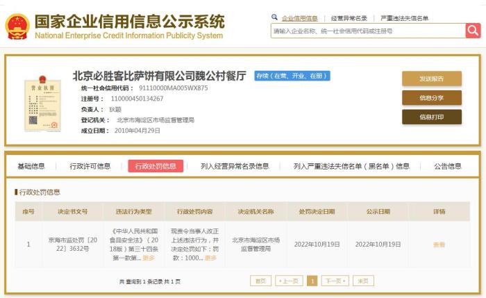 国家企业信用信息公示系统显示,近日,北京必胜客比萨饼有限公司魏公村餐厅因使用过期食品原料,被北京市海淀区市场监督管理局罚款10万元。