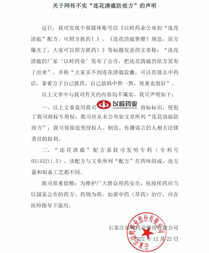 “以岭药业订阅号”微信公众号22日发布声明称,近日,公司发现个别媒体账号以《以岭药业公布的“连花清瘟”配方,可照方抓药!》《连花清瘟售罄?别急,原方曝光了,大家可以照方抓药!》等标题发表的文章称:“连花清瘟的厂家'以岭药业’发布了公告,把连花清瘟的原方发布了出来”,并称“大家买不到连花清瘟胶囊,可以直接去中药店,拿着方子自己抓药,自己放锅中熬一熬,效果也很好”。以上文章中与公司有关的内容均不属实。公司从未公布如文章所列“连花清瘟防疫方”;保留追究侵权人、制造、传播谣言的人相关法律责任的权利。“连花清瘟”配方系公司发明专利(专利号03143211.5),该配方与文章所列“配方”在药味组成、处方量和制备工艺都不同。