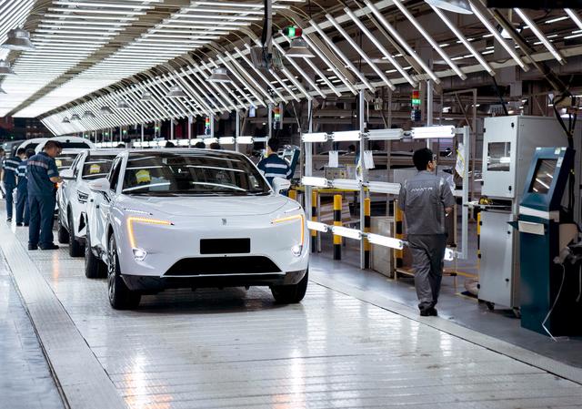 重庆市江北区的长安汽车生产基地车间内,工作人员在新能源汽车阿维塔生产线上作业。李前磊 摄