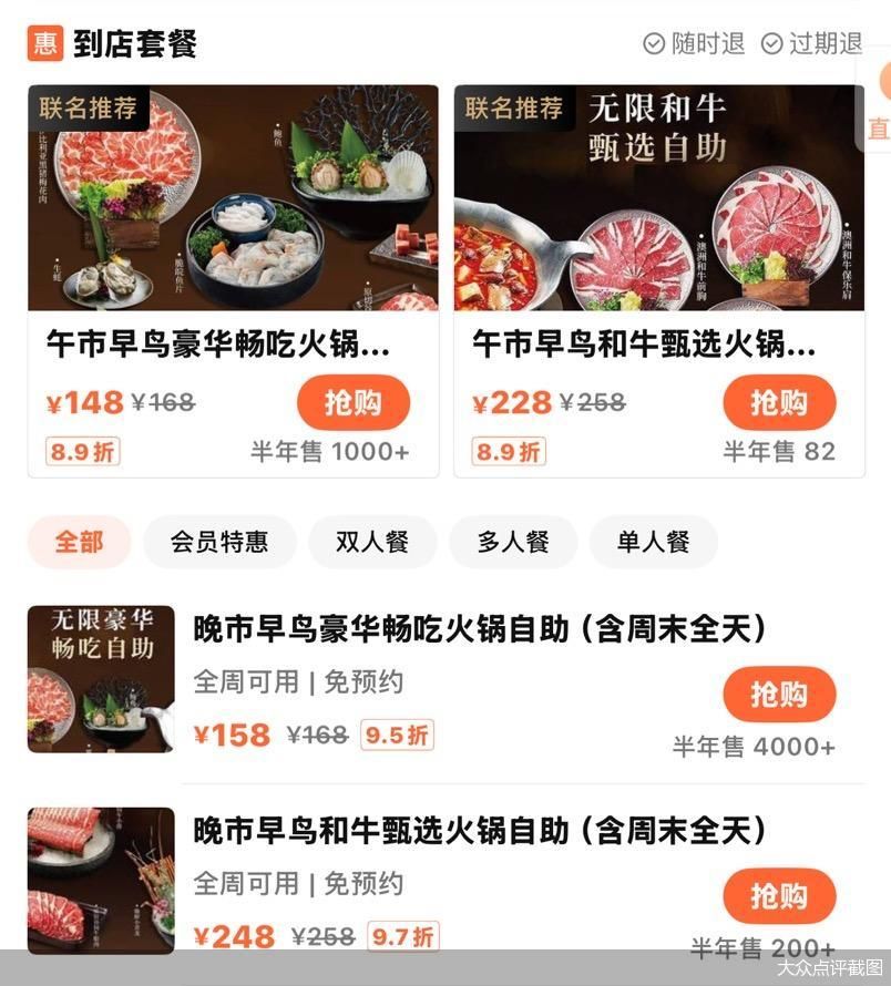 定位高端的湊湊也开始尝试亲民的自助模式。近日,湊湊在深圳、南宁、珠海三城四店推出限时放题火锅自助。价格上,品牌公众号显示,该自助午市早鸟价分为148元和228元两档。同时,产品包含多个种类,根据点评平台上的团购套餐,148元可选4款锅底,还包括10款肉类、8款海鲜以及蔬菜小食等,228元则是包括8款锅底、4款和牛、各种肉类卷以及每人限量半只的小青龙。