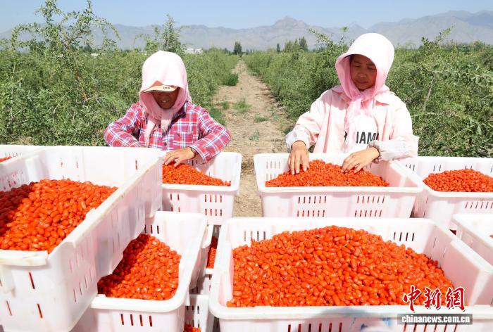 资料图为农户在宁夏一处枸杞种植基地分拣刚刚采摘的枸杞鲜果。中新网记者 于晶 摄