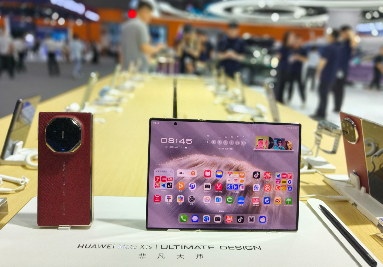 在2025中国移动全球合作伙伴大会上,华为展示了三折叠屏手机Mate XTs非凡大师。