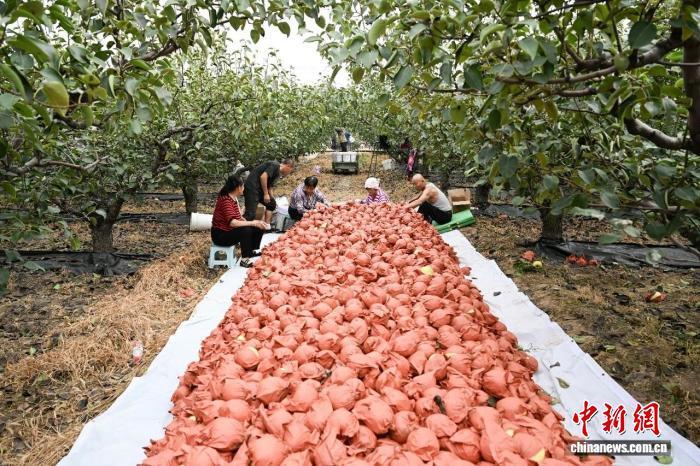 金秋时节,“晋商故里”山西祁县的梨园里,千年种植历史的“祁县酥梨”迎来丰收。图为果农正在分拣酥梨。贾发珍 摄