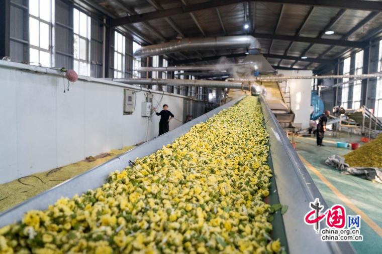 从田间采收的新鲜杭白菊,很快便被运往岚山镇中草药产业园内的永昌花茶有限公司。走进加工车间,烘干设备的轰鸣声此起彼伏,工人们正忙着对鲜菊进行筛选与打包作业。