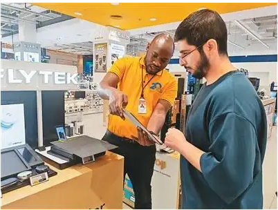 11月11日晚上9点,阿拉伯联合酋长国迪拜购物中心内依旧人头攒动。一位顾客走进电子产品连锁店沙拉夫,直奔收款台旁的讯飞柜台。只稍微看了下办公本(AINOTE 2),便决定购买。这位名叫阿卜杜拉·马吉德的顾客来自沙特。他说,他在沙特一家企业担任项目经理。每天都要参加多场会议。“我的同事用上了办公本,竭力向我推荐,但在沙特我只能网购。这次正好来迪拜出差,我决定到店试用下,然后购买。”