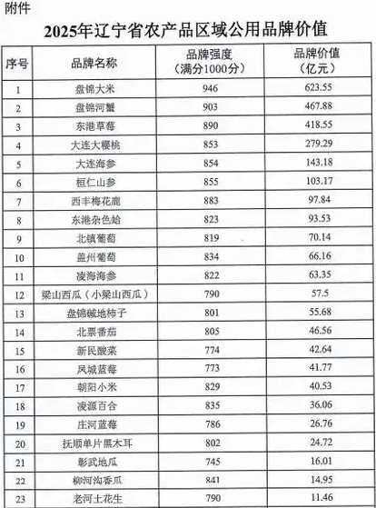 为贯彻落实质量强省品牌强省战略,打造辽宁优质特色农产品品牌,持续提升农产品区域公用品牌价值与影响力,助力乡村产业振兴,辽宁省农业农村厅、辽宁省市场监督管理局共同组织开展2025年农产品区域公用品牌价值测算。经评价,现将29个农产品区域公用品牌价值予以发布。