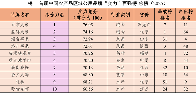 中国农产品区域公用品牌“实力”百强榜(2025)前十名。 江南大学供图
