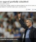 欧足联官方宣布对穆里尼奥减刑 禁赛仍5场2场缓期