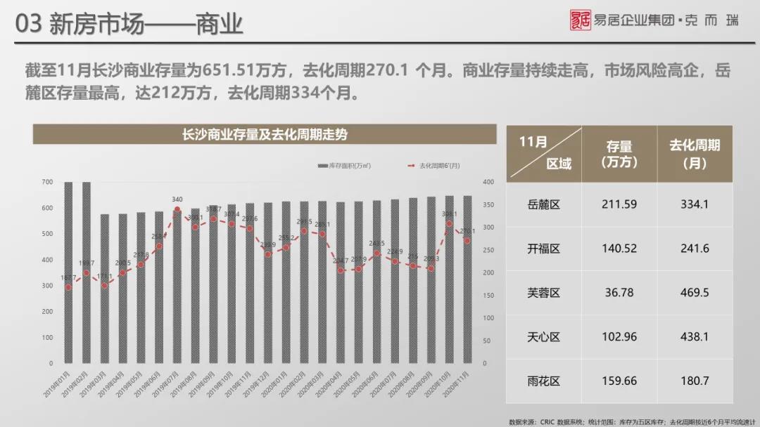 易居克而瑞近日发布的《长沙房地产市场11月监测报告》说,长沙市商业市场供应持续放量,供过于求严重,市场风险高企。截至11月底,长沙市内五区商业存量为651.51万平方米,去化周期270.1个月(合22.51年)。
