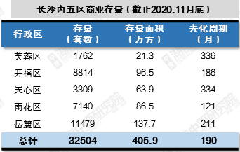 在长沙市内五区中,岳麓区商业存量套数和面积均最多,分别为11479套、137.7万平方米;去化周期最长的是芙蓉区336个月,其次是天心区334个月。
