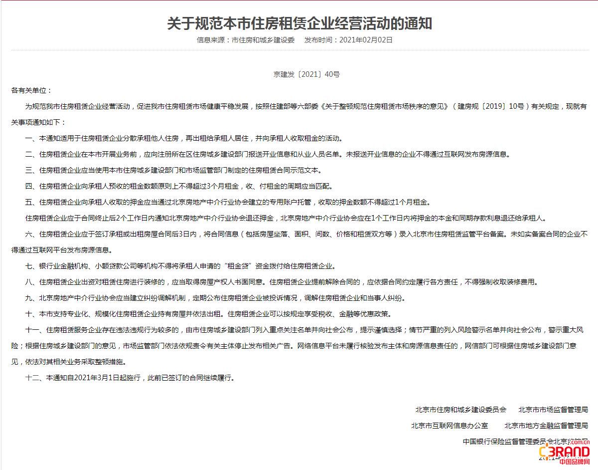 2月2日,北京市住房和城乡建设委员会、北京市市场监督管理局、北京市互联网信息办公室、北京市地方金融监督管理局、中国银行保险监督管理委员会北京监管局联合印发《关于规范住房租赁企业经营活动》的通知(以下简称《通知》),自2021年3月1日正式实施。