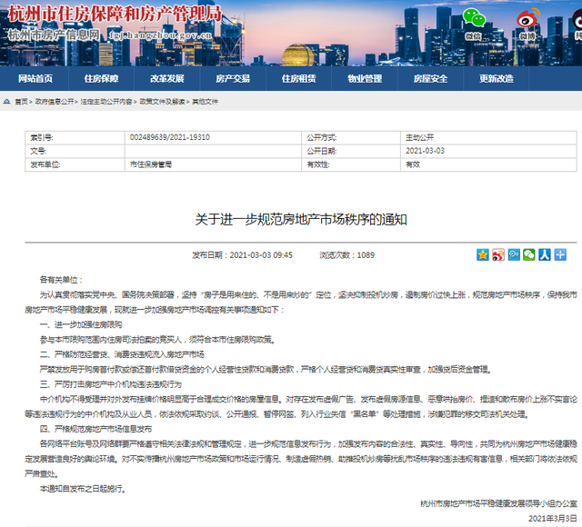 《通知》明确严格规范房地产市场信息发布。各网络平台账号及网络群要严格遵守相关法律法规和管理规定,进一步规范信息发布行为,加强发布内容的合法性、真实性、导向性,共同为杭州房地产市场健康稳定发展营造良好的舆论环境。对不实传播杭州房地产市场政策和市场运行情况、制造虚假热销、助推投机炒房等扰乱市场秩序的违法违规有害信息,相关部门将依法依规严肃查处。