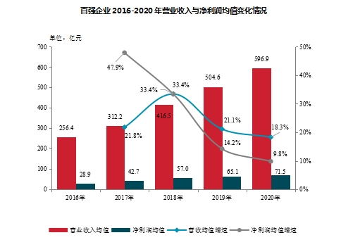 报告指出,百强企业营收与净利润保持增长态势,盈利能力持续下行。百强企业销售业绩的稳步增长带动其营业收入和净利润的持续增加,2020年,百强企业营业收入均值达596.9亿元,净利润均值达71.5亿元,分别同比增长18.3%、9.8%,增速较上年减少2.8、4.4个百分点。百强企业净利润率、净资产收益率均值分别为11.2%、14.4%,同比降低0.7、1.0个百分点。