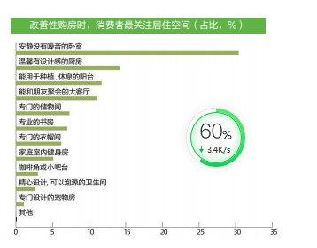 人们逐渐从“居者有其屋”向“居者优其屋”迈进。有30.4%的消费者希望有一个“安静没有噪音的卧室”,“温馨有设计感的厨房”、“能用于种植、休息的阳台”、“能和朋友聚会的大客厅”也受到一定程度的欢迎”。一线城市因为地产项目竞争激烈,开发商特别重视产品力,装修公司也更加重视装修的产品力,加上社区居民的综合素质,造成一线城市居住竞争力指数明显高于新一线及二线城市。