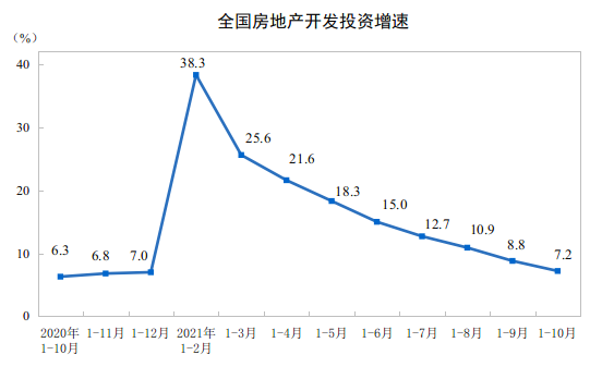 国家统计局数据显示,1—10月份,全国房地产开发投资124934亿元,同比增长7.2%;比2019年1—10月份增长14.0%,两年平均增长6.8%。