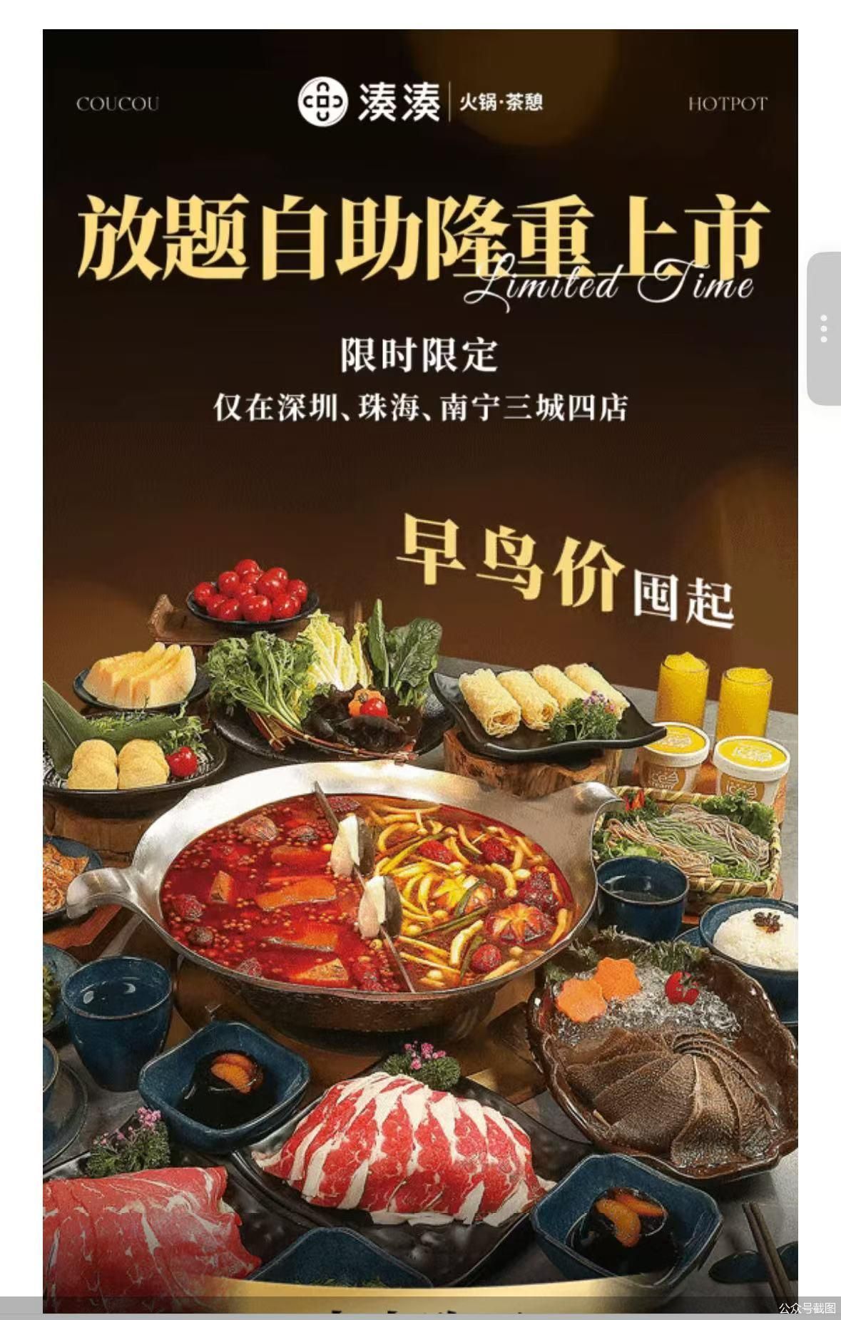定位高端的湊湊也开始尝试亲民的自助模式。近日,湊湊在深圳、南宁、珠海三城四店推出限时放题火锅自助。价格上,品牌公众号显示,该自助午市早鸟价分为148元和228元两档。同时,产品包含多个种类,根据点评平台上的团购套餐,148元可选4款锅底,还包括10款肉类、8款海鲜以及蔬菜小食等,228元则是包括8款锅底、4款和牛、各种肉类卷以及每人限量半只的小青龙。