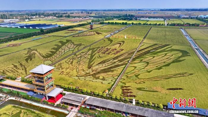 航拍银川稻渔空间乡村生态观光园的稻田画。宁夏文旅厅供图